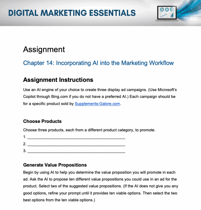 Your students will use AI tools to create three display ad campaigns for Supplements-Galore.com. They’ll generate value propositions, produce AI-driven images, and identify target markets. This assignment will help them gain firsthand experience in integrating artificial intelligence into the marketing workflow.