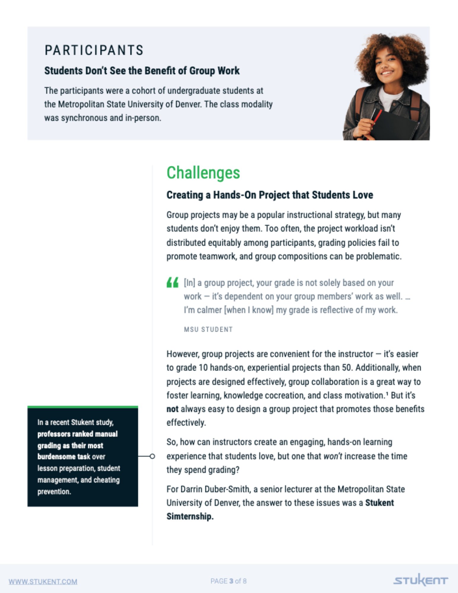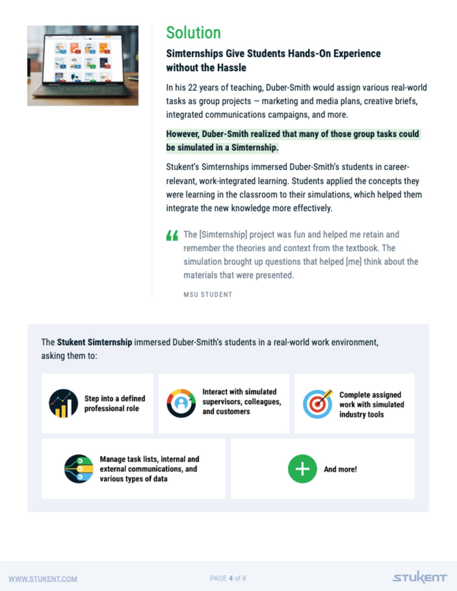 Stukent’s Simternships immersed Duber-Smith’s students in careerrelevant, work-integrated learning. Students applied the concepts they were learning in the classroom to their simulations, which helped them integrate the new knowledge more effectively.